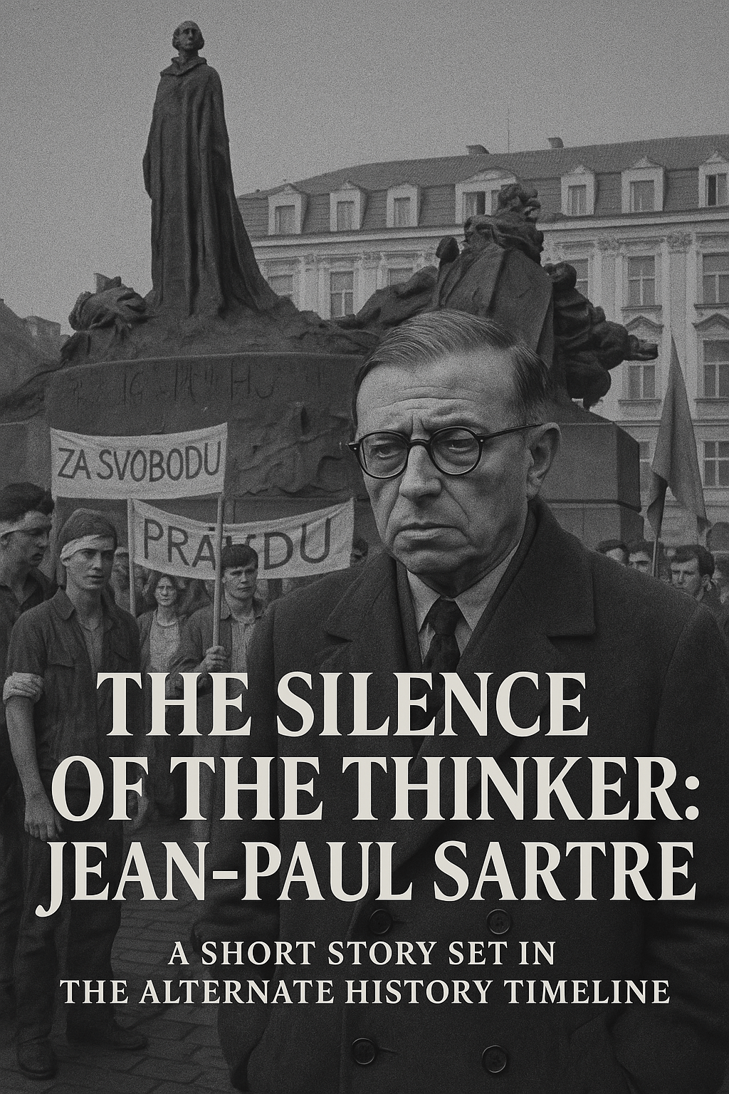 He stood in the square beneath the statue of Jan Hus, the old reformer defiant on his pedestal. Around Sartre, the square pulsed with youth—Czech students with bandaged arms, hastily painted banners, and voices hoarse from nights without sleep.