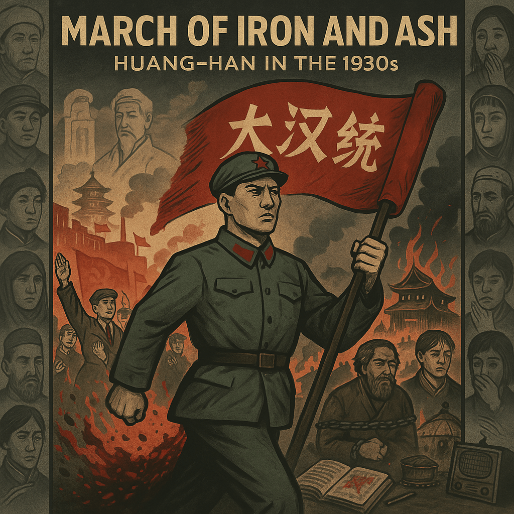 By the 1930s, Huang-Han China has evolved into a fully authoritarian, ethnonationalist state dominated by Han supremacist ideology. However, this period also marks the height of its internal contradictions and external pressures, which increasingly threaten the regime’s fragile unity. The government pursues aggressive policies of Han cultural assimilation, repression of minorities, and military expansion, but its increasingly totalitarian nature alienates large segments of the population and invites conflict with both domestic and foreign powers.